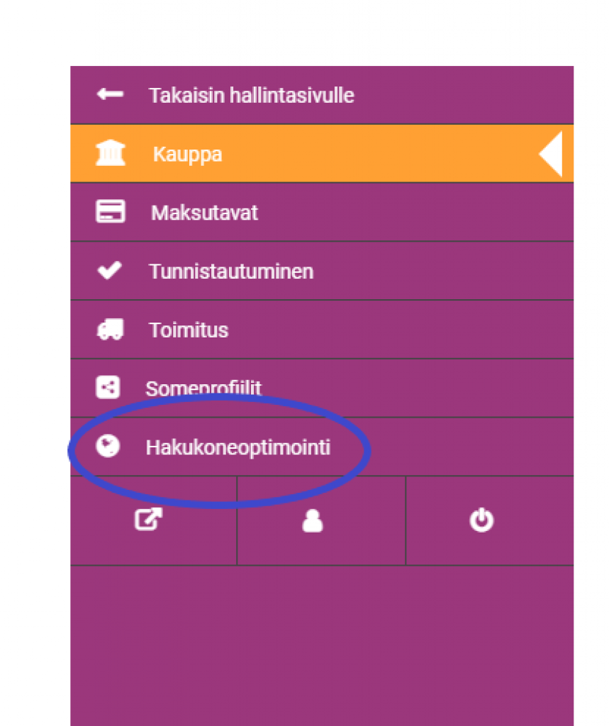 Kun olet kaupan Hallintasivulla -> Valitse Asetukset, jonka jälkeen vasemman reunan paneelista “Hakukoneoptimointi”. Pääset työstämään sisällöt.