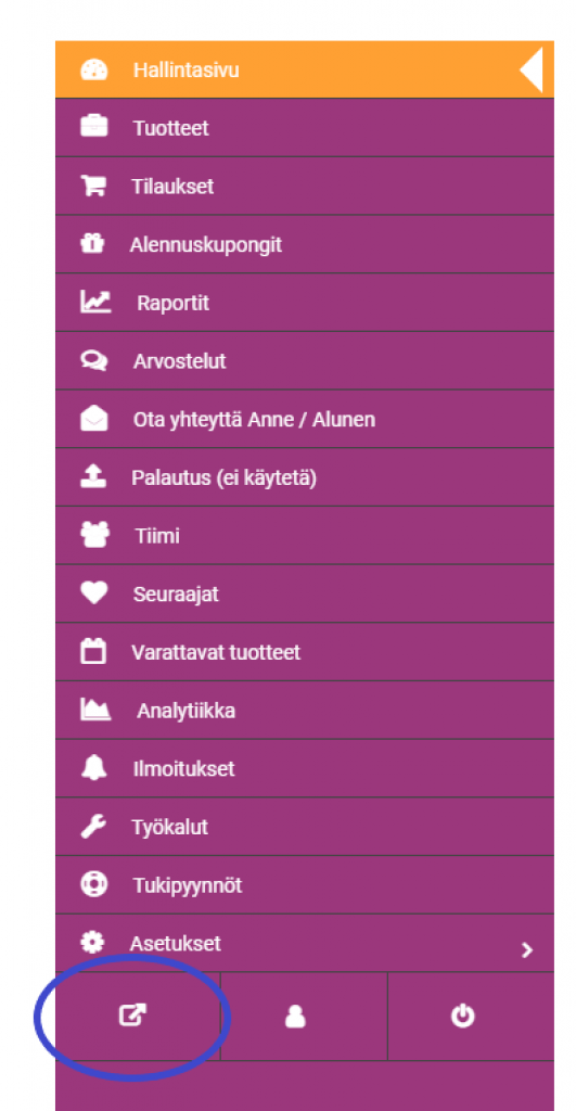 Voit katsoa kauppasivuasi osoitteessa alunen.fi/kauppa/yrityksennimi. Myös kaupan hallintasivulta pääsee klikkaamaan kauppasivulle kahta eri reittiä (“ruutunuoli”-kuvakkeet).
